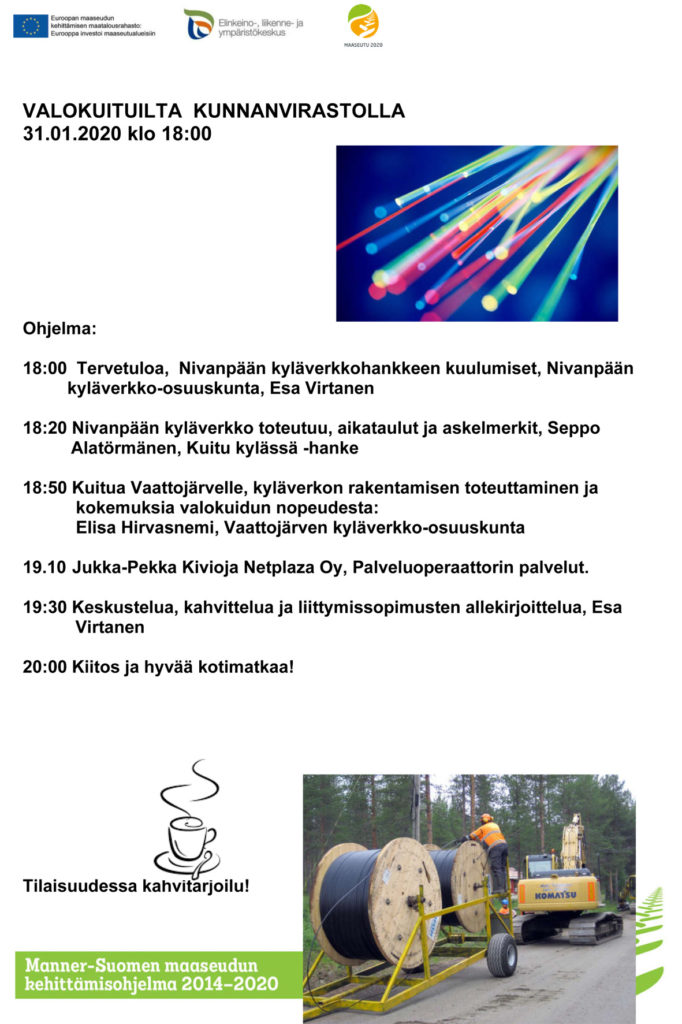 Nivanpään valokuituhankkeen tiimoilta on kokoonnuttu ensimmäisen kerran 10.7.2019 jossa projektipäällikkö Seppo Alatörmänen esitteli Leader Tunturi-Lappi r.y:n hallinnoimaa tiedotushanketta, kertoi valokuituverkon tuomista mahdollisuuksista sekä esitteli maaseuturahaston rahoitusmenetelmiä.