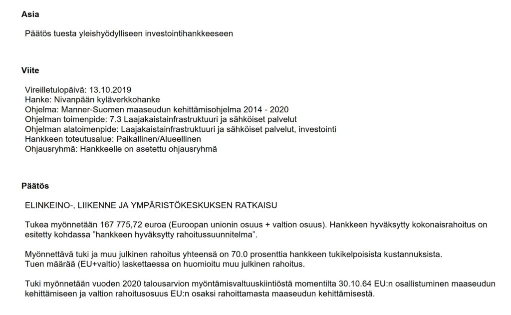 Kyllä, hankkeemme pääsi tuettujen hankkeiden joukkoon. Tänään osuuskunnan hallitus on päättänyt aloittaa varsinaisten liittymissopimusten keräämisen ja päättänyt liittymien hinnat. Varsinaisesta operaattorista pyydetään tarjoukset. Sopimus ja hinnasto löytyvät näiltä nettisivuilta.